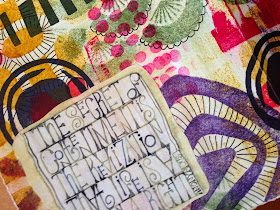 5. Drop two to three different colors onto the page….making sure to drop through the openings in the stencil. I sometimes coaxed the ink with a brush. Do not use complimentary colors or they will turn to mud. Try colors in the same family. Pinks, reds. purples and yellows or Blues, greens and yellow.